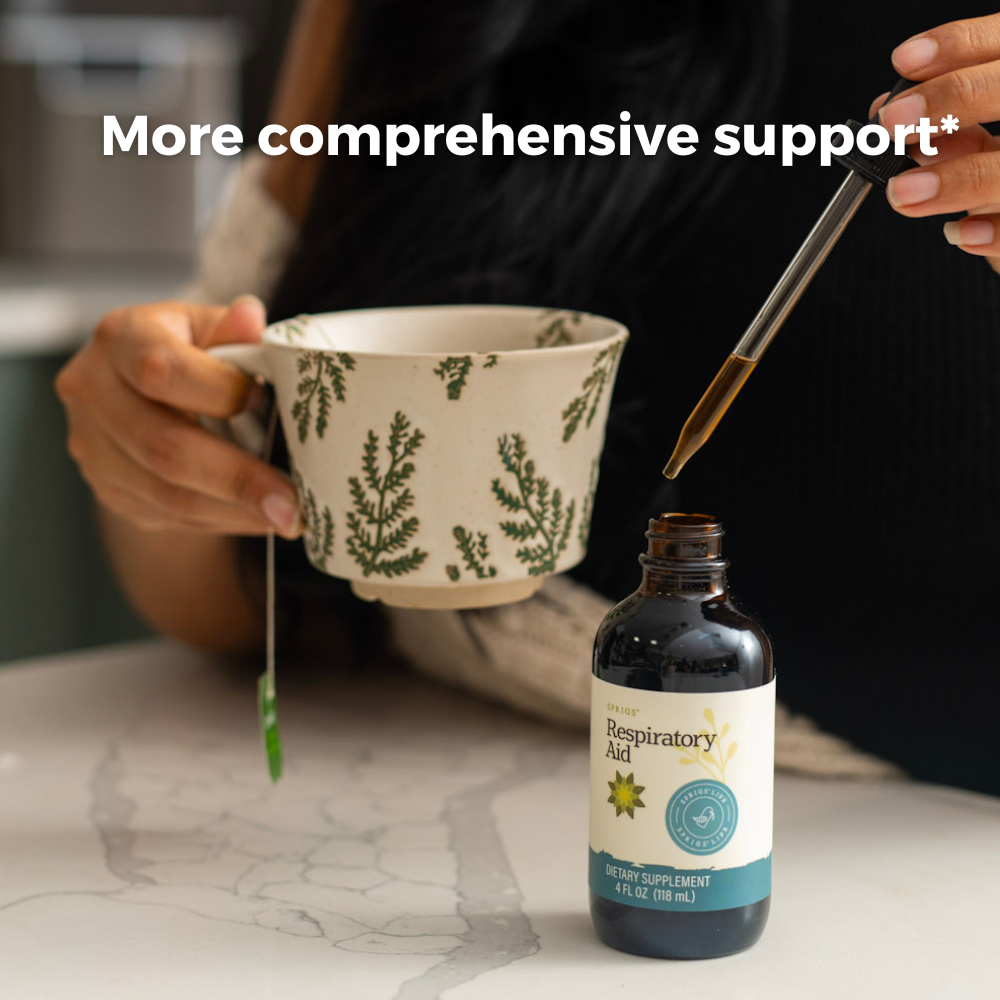 Respiratory Aid is made with Elecampane (Root), Fenugreek (Seed), Fennel (Seed), Horseradish (Root), Plantain (Leaf), Hyssop (Whole Herb), Mullein (Leaf), and Peppermint (Leaf)..