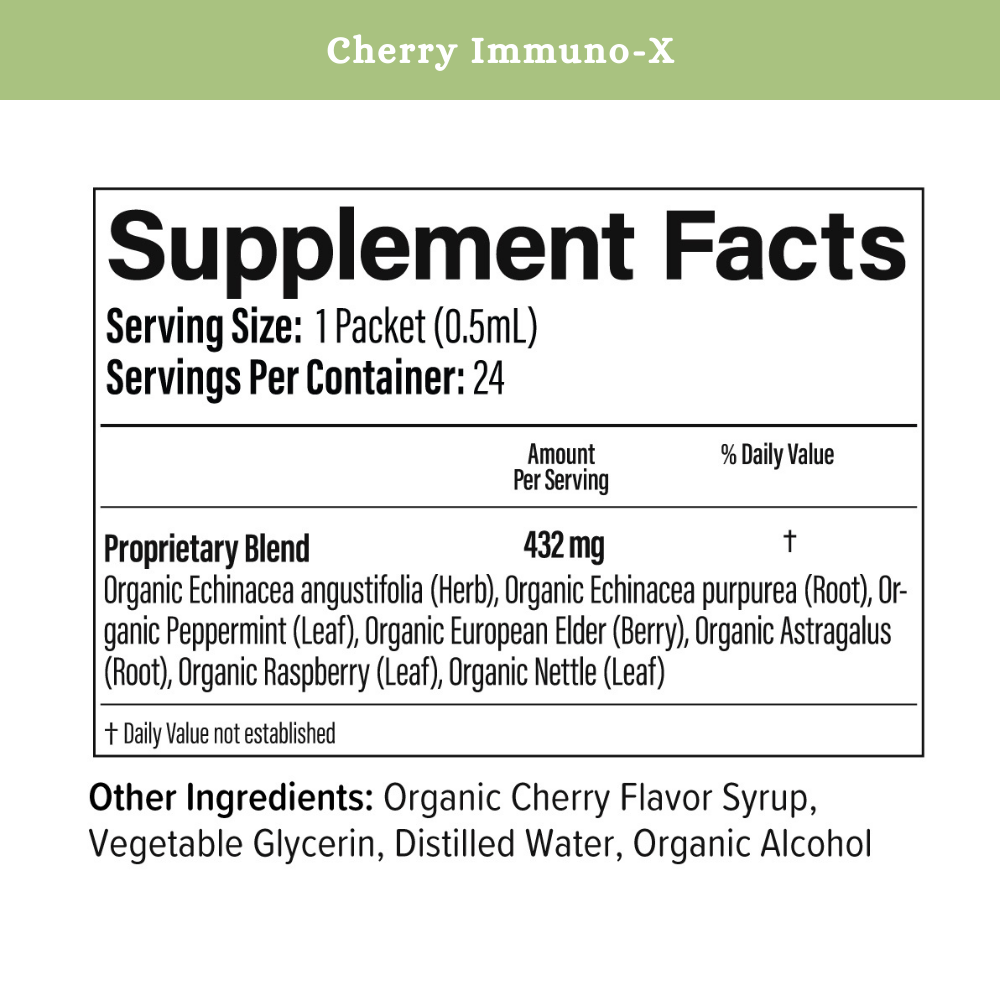 Cherry flavor Immuno-X is formulated for ages 4 and up. Children over 40lbs: 1 packet (0.5ml) daily. May be taken up to 3 times daily as needed..
