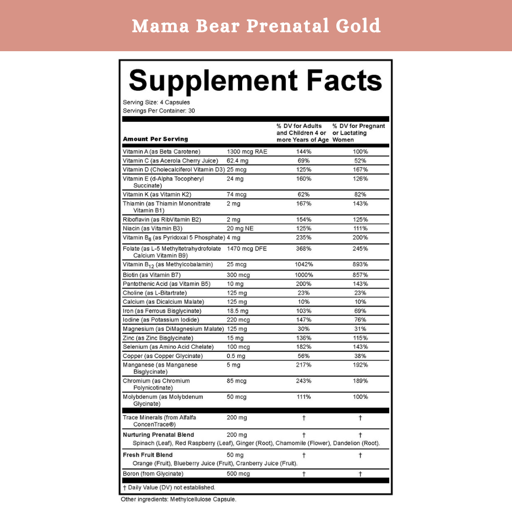 Mama Bear Prenatal contains a wide array of the vitamins and minerals known to support a healthy pregnancy. Quality, individual nutrients along with whole foods and a special Nurturing herbal blend make this a premium prenatal. It can even be taken on an empty stomach! Our prenatal contains ConcenTrace® Alfalfa, a trademarked ingredient which offers an array of naturally occurring nutrients, plus Methylated Folate, and has no fillers or other unnecessary ingredients..